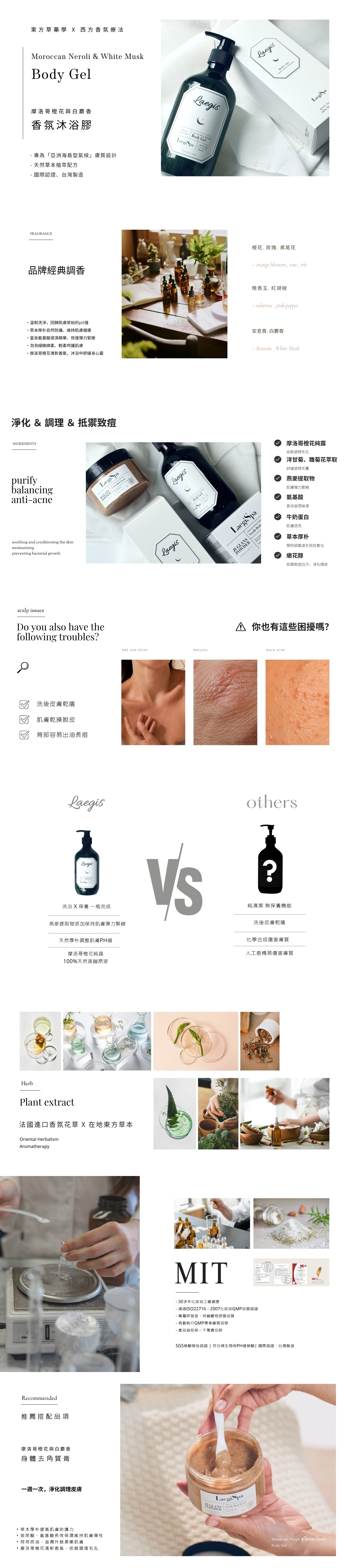 東方草藥學概念與西方香氛療癒法,溫和淨化身體肌膚的油垢和髒污,並舒緩肌膚缺水的乾燥粗糙狀況,選擇多種草本植萃以及法國進口自然精油,富含胺基酸保濕精華,清爽凝膠質地,輕鬆洗淨不殘留,洗後滋潤不乾澀,使肌膚恢復細緻嫩白!